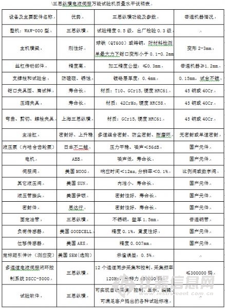 三思縱橫液壓試驗(yàn)機(jī)質(zhì)量水平在國(guó)產(chǎn)試驗(yàn)機(jī)中是一流的,主要表現(xiàn)在:剛性好,精度高,動(dòng)力平穩(wěn),噪音低,頻率高,擴(kuò)展性強(qiáng)。例如: