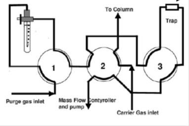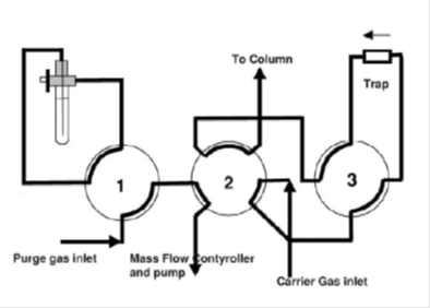 動態(tài)頂空常用的方法是吹掃捕集技術(shù),吹掃-捕集實質(zhì)上是一種連續(xù)氣體萃取技術(shù),吹掃氣(一般使用氮氣)通過液體或固體樣品,將樣品中的可揮發(fā)組分(其中包括欲測組分)帶出,然后用冷凍或固體吸附劑吸附的方法,將欲測組分捕集下來,再通過熱解吸的方法,將欲測組分解吸下來,進行分析。