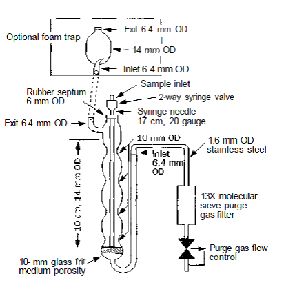 (1)玻璃吹掃裝置可具有容納5 mL 或25 mL樣品, 當(dāng)檢測的靈敏度能以達到方法的檢測限時,使用5 mL 的吹掃裝置, 應(yīng)盡量減少樣品上方氣體空間,減少死體積的影響, 吹掃瓶底部有一玻璃砂芯, 它使吹掃氣成為分散細(xì)微的氣泡通過水樣, 并使吹掃氣從距水樣底部5 mm 處引入, 初始?xì)馀葜睆綉?yīng)<3 mm , 吹掃裝置也可使用針型噴口。