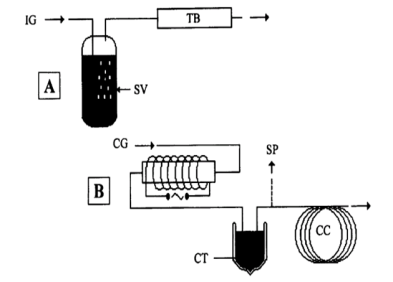 B 是把吸附劑管加熱用載氣(CG)把樣品吹掃到冷阱(CT)中,再去掉冷阱用載氣經(jīng)分流管(SP)到色譜柱(CC)