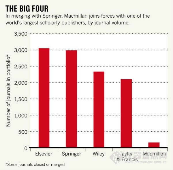 國際學(xué)術(shù)期刊有四巨頭的說法,分別是Springer (2,987本雜志), Elsevier (3,057本雜志), Wiley (2,339本雜志) and Taylor & Francis (2,105本雜志),本來Elsevier排行老大。但是這次合并將增加自然集團(tuán)的的160雜志,使Springer一下變成期刊數(shù)量的老大,又因?yàn)樽匀挥写罅扛咚綄W(xué)術(shù)期刊,也讓這個(gè)老大在期刊的水平上揚(yáng)眉吐氣了一把。