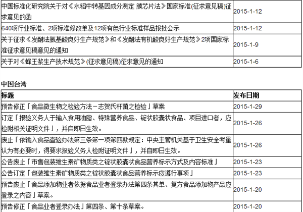 本次匯總的2015年1月份食品相關(guān)法規(guī)涵蓋了中國大陸和中國臺灣,包括法規(guī)標題和發(fā)布日期,中國大陸的相關(guān)法規(guī)按照發(fā)布機構(gòu)進行分類。