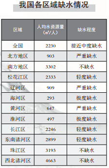 我國是一個干旱缺水嚴(yán)重的國家。由于可利用的淡水資源有限,加上水資源浪費、污染以及氣候變暖、降水減少等原因,加劇了水資源短缺的危機。按照國際標(biāo)準(zhǔn),人均水資源低于3000立方米為輕度缺水,低于2000立方米為中度缺水,低于1000立方米為重度缺水,低于500立方米為極度缺水。照此,目前我國有16個省區(qū)重度缺水,6個省區(qū)極度缺水;全國600多個城市中有400多個屬于“嚴(yán)重缺水”和“缺水”城市。京津冀人均水資源僅286立方米,為全國人均的1/8,世界人均的1/32,遠(yuǎn)低于國際公認(rèn)的人均500立方米的“極度缺水”標(biāo)準(zhǔn)。