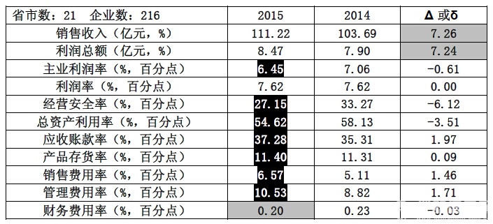 ——在11個(gè)經(jīng)濟(jì)運(yùn)行指標(biāo)中,銷售收入、利潤(rùn)總額好于上年同期,財(cái)務(wù)費(fèi)用率略好于上年同期,利潤(rùn)率持平,其余7個(gè)指標(biāo)差于上年。其中銷售收入實(shí)現(xiàn)111.22億元,同比+7.26%(比1-4月上升1.30個(gè)百分點(diǎn)),凈增7.53億元,9個(gè)省市增幅高于行業(yè)均值。實(shí)現(xiàn)利潤(rùn)總額8.47億元,同比+7.24%(比1-4月上升1.78個(gè)百分點(diǎn)), 包括上海在內(nèi)的12個(gè)省市的增幅高于行業(yè)均值。