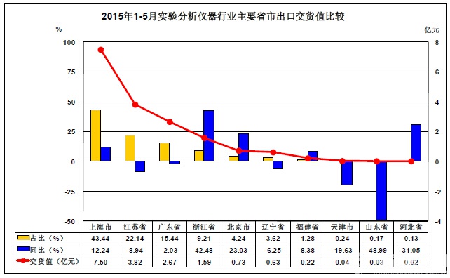 4、2015年1-5月實(shí)驗(yàn)分析儀器行業(yè)主要省市出口交貨值比較