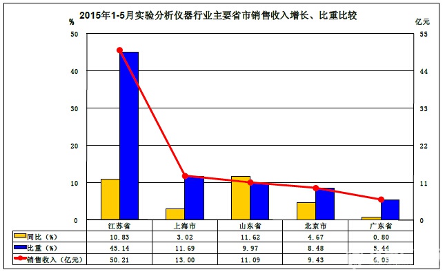 1、2015年1-5月實(shí)驗(yàn)分析儀器行業(yè)主要省市銷售收入增長(zhǎng)、比重比較