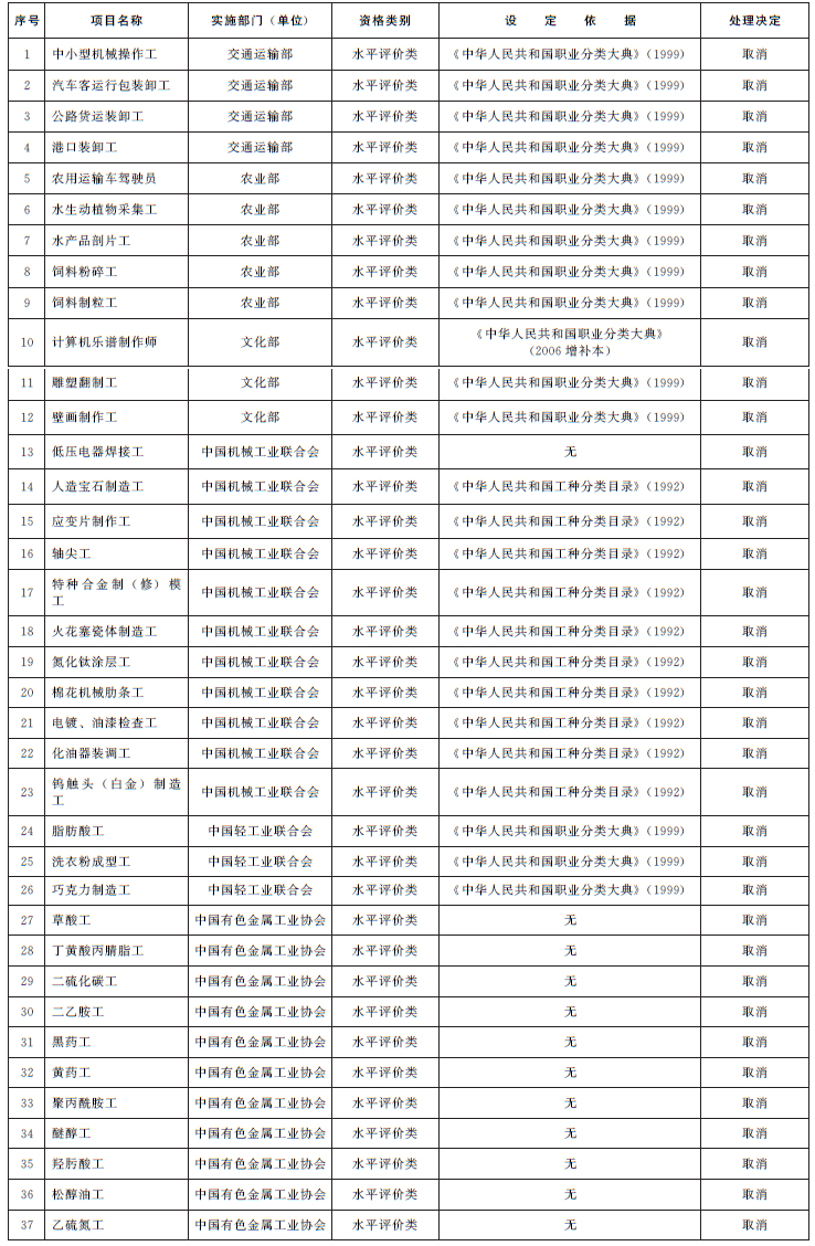 二、取消的技能人員職業(yè)資格許可和認(rèn)定事項(xiàng)