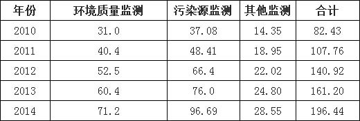 2010-2014年中國(guó)環(huán)境監(jiān)測(cè)細(xì)分市場(chǎng)規(guī)模(單位:億元)