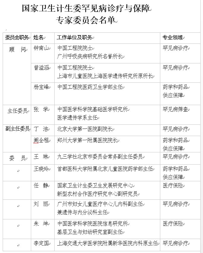 該專家委員會(huì)由鐘南山、曾溢滔、楊寶峰3位中國(guó)工程院院士擔(dān)任顧問(wèn),由18名相關(guān)領(lǐng)域?qū)<医M成。主要包括:罕見(jiàn)病診療領(lǐng)域6人,藥學(xué)和藥品供應(yīng)保障領(lǐng)域4人,罕見(jiàn)病篩查領(lǐng)域、醫(yī)療保險(xiǎn)領(lǐng)域、新農(nóng)合領(lǐng)域、衛(wèi)生經(jīng)濟(jì)學(xué)領(lǐng)域各2人。專家委員會(huì)的工作職責(zé)是:研究提出符合我國(guó)國(guó)情的罕見(jiàn)病定義和病種范圍,組織制定罕見(jiàn)病防治有關(guān)技術(shù)規(guī)范和臨床路徑,對(duì)罕見(jiàn)病的預(yù)防、篩查、診療、用藥、康復(fù)及保障等工作提出建議。專家委員會(huì)自發(fā)文之日起任期3年。