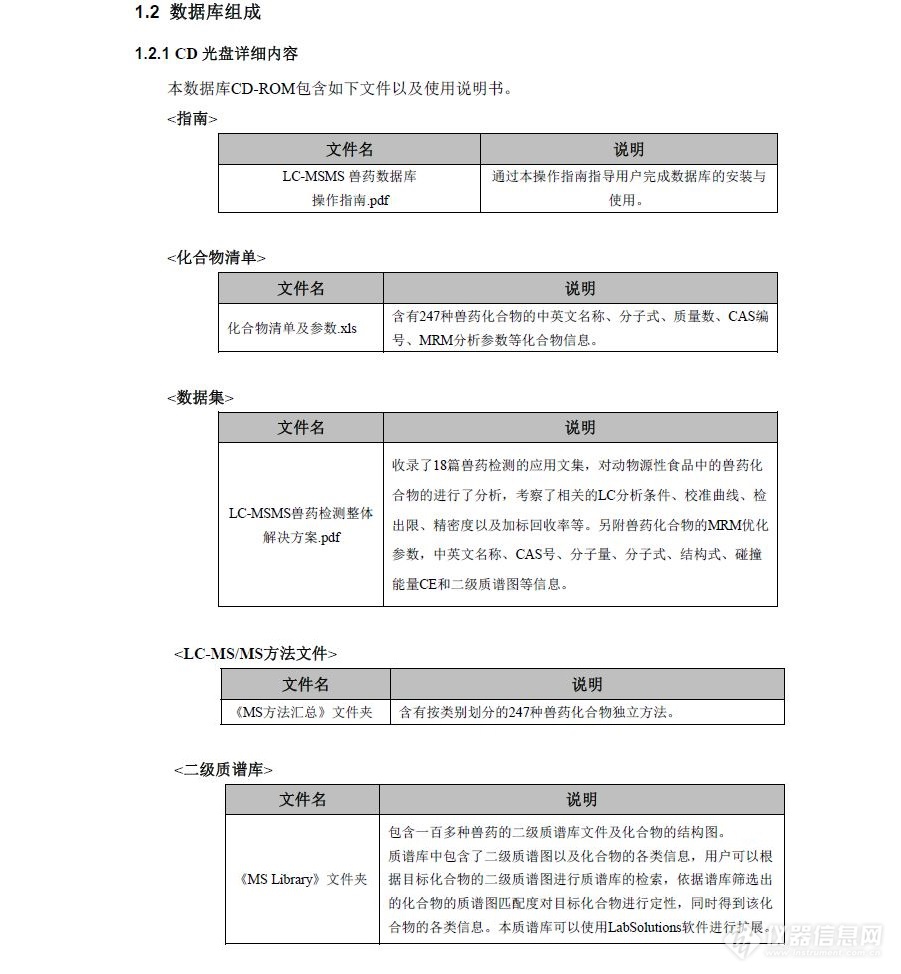 長(zhǎng)期以來(lái),島津公司一致關(guān)注動(dòng)物源食品中獸藥殘留的檢測(cè),并及時(shí)提供全面的解決方案。此次重磅推出《LC-MS/MS MRM獸殘數(shù)據(jù)庫(kù)》,最大程度節(jié)省了一線檢測(cè)工作者在MRM優(yōu)化等方法開(kāi)發(fā)上所花費(fèi)的時(shí)間與精力。數(shù)據(jù)庫(kù)的獸藥化合物清單及參數(shù)中登記信息包括247種獸藥化合物的MRM 優(yōu)化參數(shù)、中文名稱、英文名稱、CAS號(hào)、結(jié)構(gòu)式、分子量、分子式、MRM參數(shù)等,方便用戶直接查找化合物相關(guān)參數(shù),為食品中獸藥殘留篩查和監(jiān)測(cè)提供了簡(jiǎn)便快速的途徑。數(shù)據(jù)庫(kù)中還有LC-MS/MS獸藥檢測(cè)整體解決方案,我們對(duì)數(shù)據(jù)庫(kù)中獸藥化合物進(jìn)行了分析,考察了相關(guān)的LC分析條件、校準(zhǔn)曲線、檢出限、精密度以及加標(biāo)回收率等,并且數(shù)據(jù)都得到島津合作實(shí)驗(yàn)室的驗(yàn)證。為用戶在液相部分條件優(yōu)化提供了參考依據(jù)。在數(shù)據(jù)庫(kù)的MS方法匯總中,含有按類別劃分的匯總方法,同時(shí)還含有247種獸藥化合物的獨(dú)立方法。用戶可根據(jù)實(shí)際分析情況來(lái)調(diào)用方法,可靈活多變的快速實(shí)現(xiàn)多組分同時(shí)分析。同時(shí)還提供了MS Library,其中包含了獸藥的二級(jí)質(zhì)譜庫(kù)文件及化合物的結(jié)構(gòu)圖。質(zhì)譜庫(kù)中包含了二級(jí)質(zhì)譜圖以及化合物的各類信息,用戶可以根據(jù)目標(biāo)化合物的二級(jí)質(zhì)譜圖進(jìn)行質(zhì)譜庫(kù)的檢索,依據(jù)譜庫(kù)篩選出的化合物的質(zhì)譜圖匹配度對(duì)目標(biāo)化合物進(jìn)行定性,同時(shí)得到該化合物的各類信息。本數(shù)據(jù)庫(kù)收錄了247種獸藥的檢測(cè)參數(shù)和二級(jí)質(zhì)譜圖庫(kù),不僅適用于食品中獸藥殘留的檢測(cè),還可以擴(kuò)展到與獸藥檢測(cè)相關(guān)的養(yǎng)殖業(yè)、環(huán)境和醫(yī)藥等應(yīng)用領(lǐng)域?!禠C-MS/MS MRM獸藥殘留數(shù)據(jù)庫(kù)》的推出為從事獸藥檢測(cè)的島津用戶提供了極大的便利。