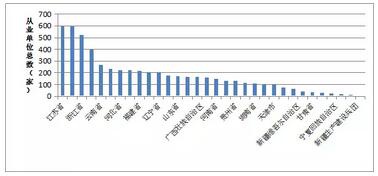 從從業(yè)單位數(shù)量看,江蘇省、廣東省、浙江省均超過(guò)500家。三省分別占從業(yè)單位總數(shù)的10.54%、10.47%和9.23%,形成第一集團(tuán),重慶市作為第二集團(tuán)的排頭以近7%的占比緊隨其后,包括青海省、甘肅省在內(nèi)的7個(gè)地區(qū),其占比分別均不足1%。環(huán)境服務(wù)業(yè)從業(yè)單位地域分布如圖12所示。