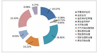 水污染治理、危險(xiǎn)廢物治理和環(huán)境保護(hù)監(jiān)測(cè)位列細(xì)分領(lǐng)域年收入三甲,分別超過(guò)600億元、500億元和400億元。各領(lǐng)域年收入占比如圖2所示。