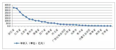 從企業(yè)盈利水平看,廣東省、北京市、江蘇省、上海市、浙江省的企業(yè)營(yíng)業(yè)利潤(rùn)額位居全國(guó)前列,僅廣東省一地的營(yíng)業(yè)利潤(rùn)就達(dá)營(yíng)業(yè)利潤(rùn)總額的近17%,尾隨其后的北京市也以近22億元的營(yíng)業(yè)利潤(rùn)超過(guò)總額的13%,甘肅省、新疆維吾爾自治區(qū)、內(nèi)蒙古自治區(qū)、寧夏回族自治區(qū)和廣西壯族自治區(qū)的年?duì)I業(yè)利潤(rùn)均為負(fù)值,顯示虧損。