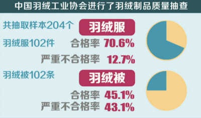 結(jié)果顯示,羽絨服合格率70.6%,羽絨被合格率45.1%,嚴(yán)重不合格率羽絨服為12.7%,羽絨被為43.1%。