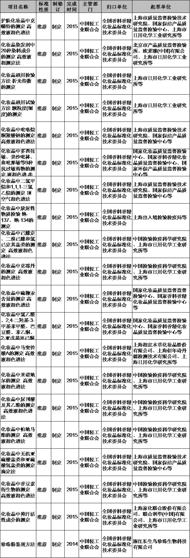 2014年第一批國家標(biāo)準(zhǔn)制修訂計劃擬制定的化妝品檢測標(biāo)準(zhǔn):