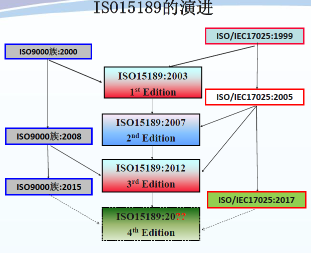 ISO15189在國(guó)內(nèi)官方中國(guó)合格評(píng)定國(guó)家認(rèn)可委員會(huì)(CNAS)名字是《醫(yī)學(xué)實(shí)驗(yàn)室質(zhì)量和能力認(rèn)可準(zhǔn)則》,至此共演進(jìn)了3版:ISO15189:2003、ISO15189:2007、ISO15189:2012,現(xiàn)在正在執(zhí)行的是ISO15189:2012。