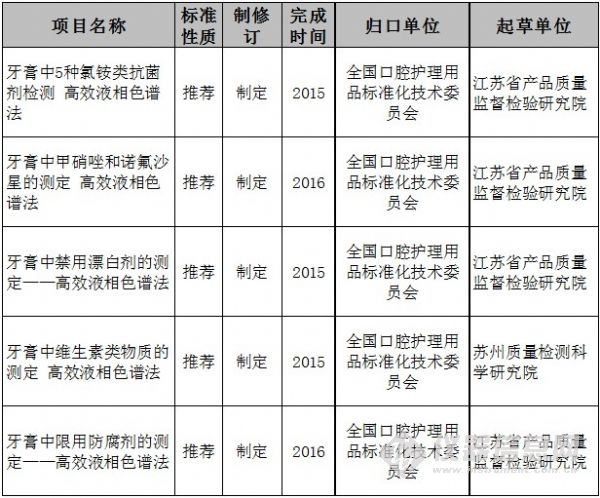 我國(guó)將制定5項(xiàng)牙膏國(guó)家檢測(cè)標(biāo)準(zhǔn)方法,涉及抗菌劑檢測(cè)、防腐劑檢測(cè)、漂白劑檢測(cè)、維生素類物質(zhì)檢測(cè)等,這5項(xiàng)標(biāo)準(zhǔn)都采用高效液相色譜法,計(jì)劃2015年完成,由江蘇省產(chǎn)品質(zhì)量監(jiān)督檢驗(yàn)研究院、蘇州質(zhì)量檢測(cè)科學(xué)研究院負(fù)責(zé)起草。