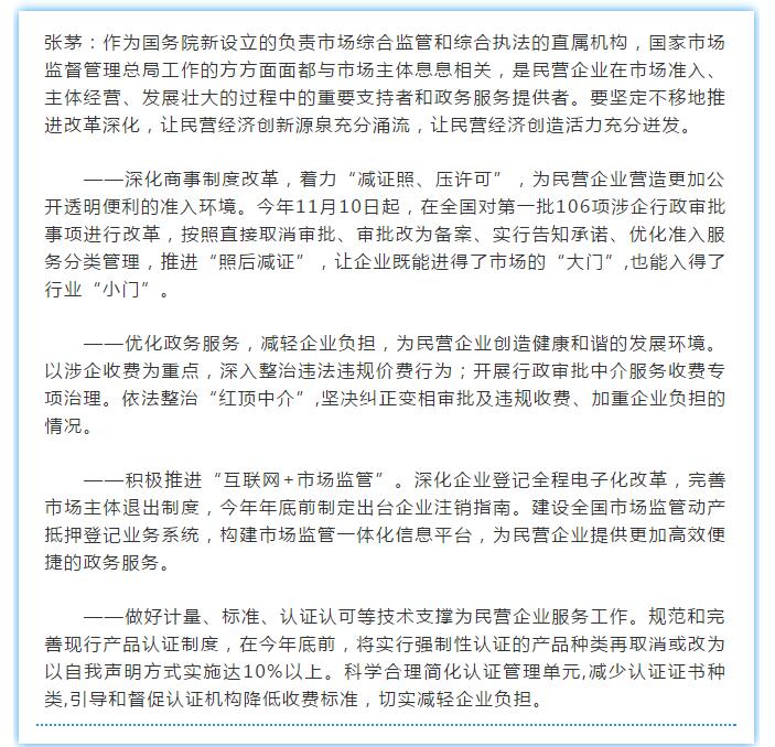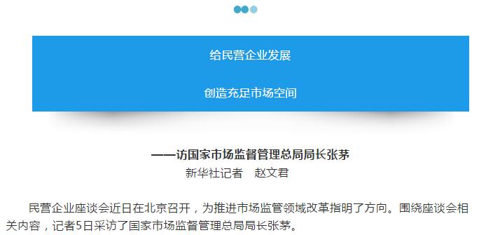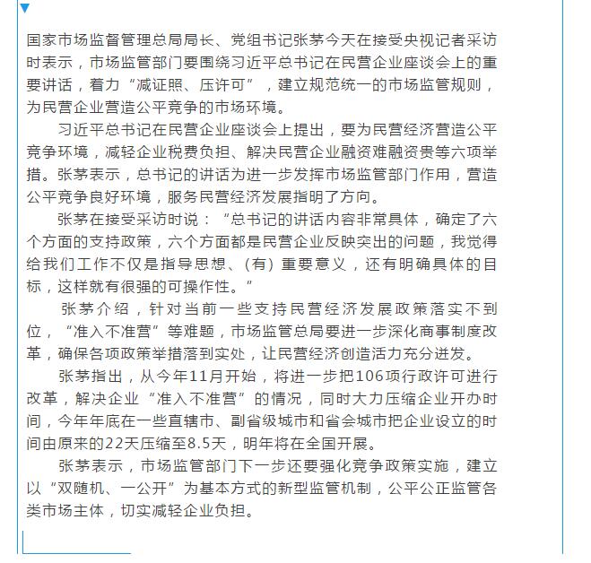 11月5日,新華社、中央電視臺(tái)記者就落實(shí)民營(yíng)企業(yè)座談會(huì)精神,推進(jìn)市場(chǎng)監(jiān)管領(lǐng)域改革等相關(guān)內(nèi)容,采訪了國(guó)家市場(chǎng)監(jiān)督管理總局局長(zhǎng)張茅。