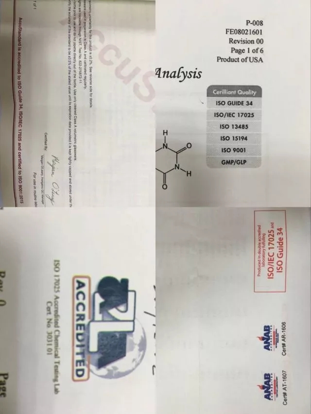 一般標準物質(zhì)/參考物質(zhì)(RM),不含有以上標識的標準物質(zhì),如國外經(jīng)ISO Guide 34 or /and ISO/IEC 17025等授權(quán)以及國內(nèi)相關(guān)資質(zhì)的生產(chǎn)商所提供的標準物質(zhì),如德國Dr.E, 美國SUPLCO、Cerilliant、AccuStandard等,國內(nèi)如環(huán)境檢測科學(xué)研究院標識為SB的標物、一些標識BW的標物等(BW的標物是未通過總局批準,沒有取得有證標準物質(zhì)號)。
