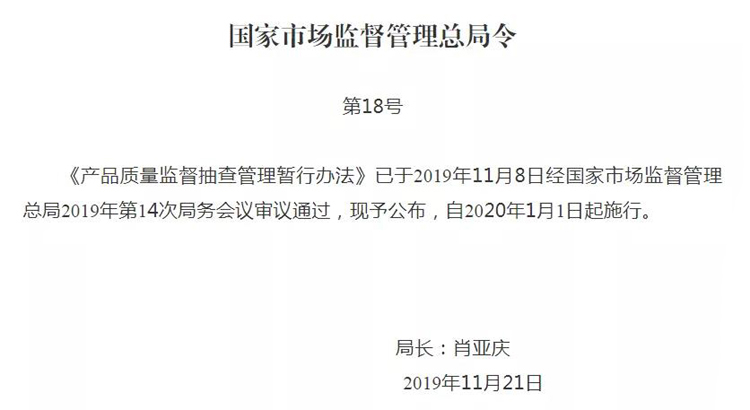 第五十六條 本辦法自2020年1月1日起施行。2010年12月29日原國家質(zhì)量監(jiān)督檢驗(yàn)檢疫總局令第133號(hào)公布的《產(chǎn)品質(zhì)量監(jiān)督抽查管理辦法》、2014年2月14日原國家工商行政管理總局令第61號(hào)公布的《流通領(lǐng)域商品質(zhì)量抽查檢驗(yàn)辦法》、2016年3月17日原國家工商行政管理總局令第85號(hào)公布的《流通領(lǐng)域商品質(zhì)量監(jiān)督管理辦法》同時(shí)廢止。