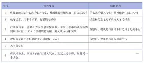 例如,羊毛檢測人員按照檢測標(biāo)準(zhǔn)SN/T0473—2003《進出口含脂毛檢驗規(guī)程》中5.3.1氣流儀法,用微拉氣流儀進行羊毛細度的檢測。在監(jiān)督過程中,要注意觀察該人員的幾個關(guān)鍵操作步驟是否規(guī)范、流暢,具體監(jiān)督要點參見表1。