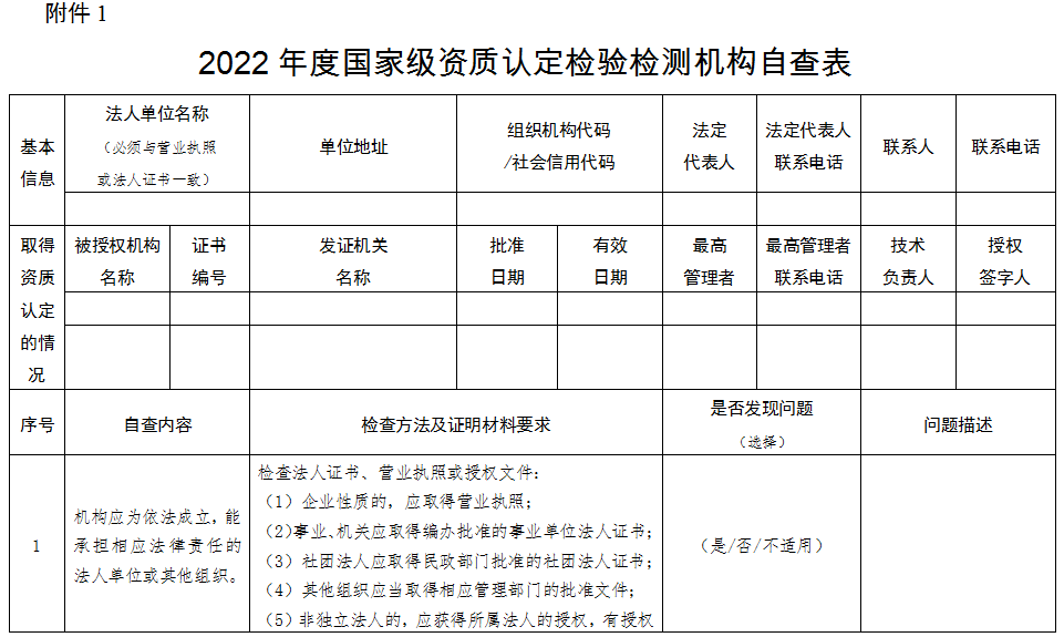 附件:1. 2022年度國(guó)家級(jí)資質(zhì)認(rèn)定檢驗(yàn)檢測(cè)機(jī)構(gòu)自查表
