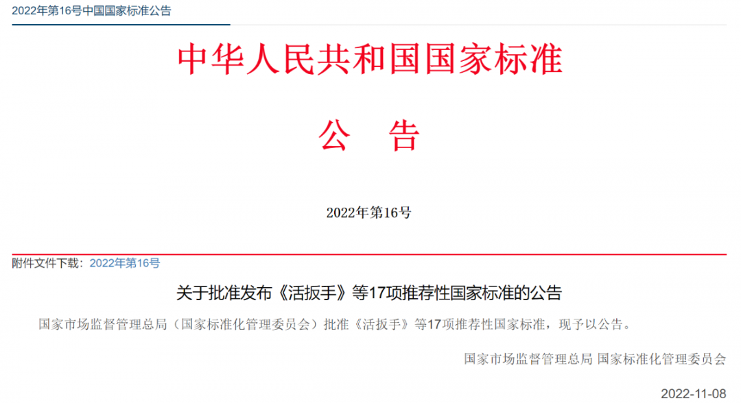 關(guān)于批準發(fā)布《活扳手》等17項推薦性國家標準的公告