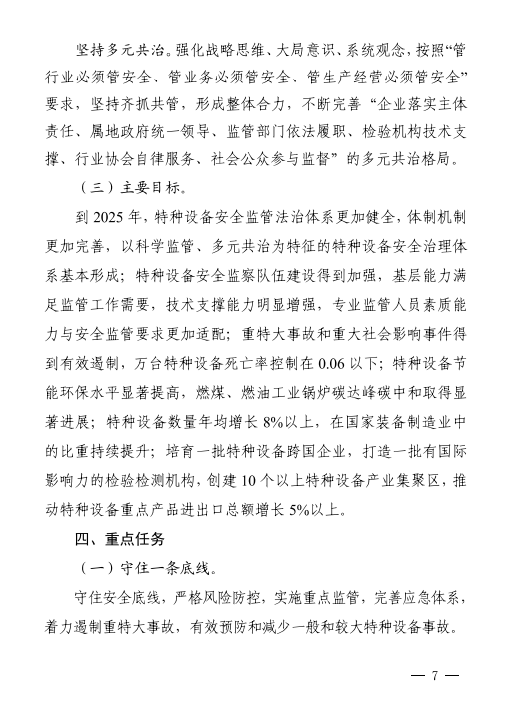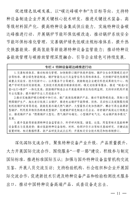 《規(guī)劃》主要目標(biāo)提出,培育一批特種設(shè)備跨國企業(yè),打造一批有國際影響力的檢驗(yàn)檢測機(jī)構(gòu),創(chuàng)建10個(gè)以上特種設(shè)備產(chǎn)業(yè)集聚區(qū),推動(dòng)特種設(shè)備重點(diǎn)產(chǎn)品進(jìn)出口總額增長5%以上。