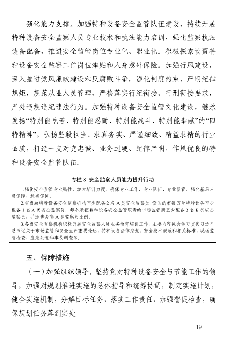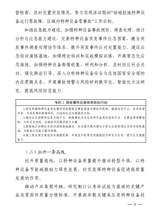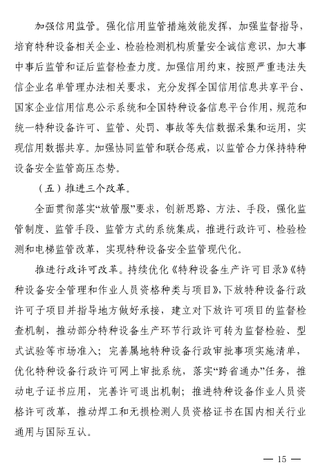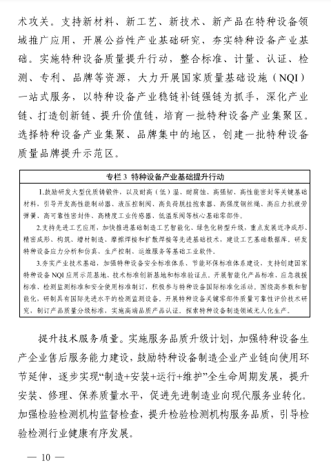 強(qiáng)化服務(wù)支撐。強(qiáng)化特種設(shè)備檢驗(yàn)對(duì)安全檢查工作和企業(yè)安全管理的技術(shù)支撐,以提升科研與技術(shù)能力為導(dǎo)向,創(chuàng)新檢驗(yàn)檢測方式,探索智能檢驗(yàn)?zāi)J?,提高檢驗(yàn)工作質(zhì)量。合理規(guī)劃檢驗(yàn)檢測機(jī)構(gòu)布局,支持特檢機(jī)構(gòu)做優(yōu)做強(qiáng),打造具有國際一流技術(shù)競爭力的國家級(jí)特檢機(jī)構(gòu)和一批國內(nèi)領(lǐng)先水平的區(qū)域級(jí)特檢機(jī)構(gòu);發(fā)揮省,市級(jí)特檢機(jī)構(gòu)公益屬性,積極承擔(dān)屬地保障性檢驗(yàn)工作,有序引入社會(huì)檢驗(yàn)機(jī)構(gòu)和企業(yè)自檢機(jī)構(gòu);鼓勵(lì)特檢機(jī)構(gòu)拓展國際業(yè)務(wù),參與國際競爭,增強(qiáng)國際影響力。