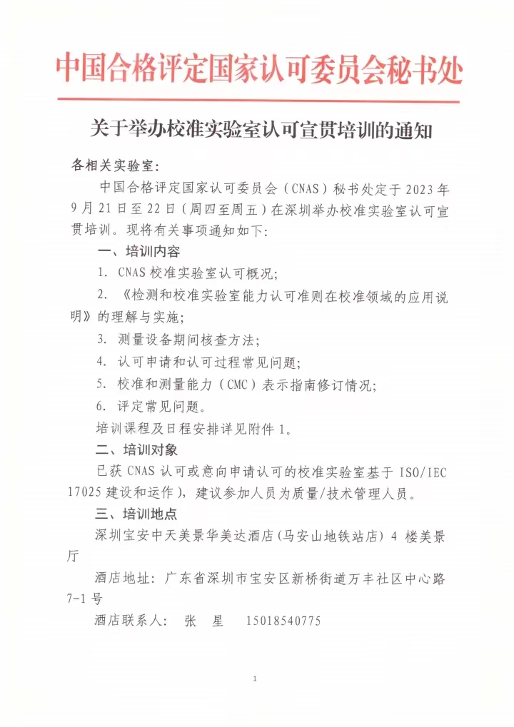 中國合格評定國家認可委員會(CNAS)秘書處定于2023年9月21日至22日(周四至周五)在深圳舉辦校準實驗室認可宣貫培訓(xùn)?,F(xiàn)將有關(guān)事項通知如下: