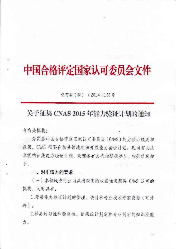 中國合格評定國家認可委員會發(fā)布征集CNAS 2015年能力驗證計劃通知